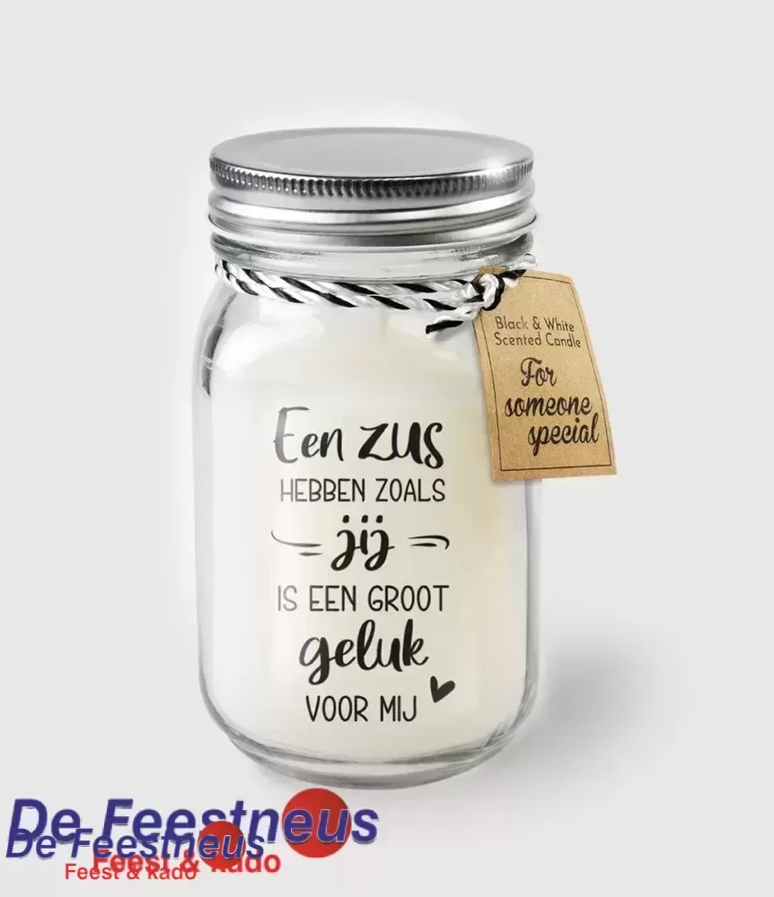De Black & White geurkaars – Zus is een geurkaars in een glazen potje met deksel uit de Paper Dreams collectie Black & White scented candles. Deze heerlijke frisse geurkaars hebben circa 340 gram kaarsvet waardoor ze circa 80 branduren hebben! De geurkaars heeft een lichte vanille geur en ruikt daardoor niet te overdreven maar wel heerlijk fris!Een super lekkere frisse geurkaars die perfect als cadeau kan worden gegeven.Na het opbranden kan het potje natuurlijk nog dienst doen als theelichthouder.Afmetingen 7.5×7.5×13.5 cm. (bxdxh)