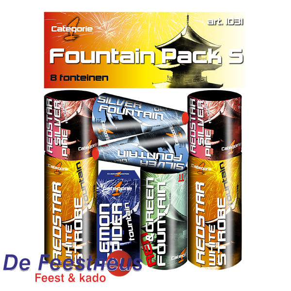 Fountain Pack S, een klein assortiment met geweldig sierlijke Categorie1-fonteinen. In dit assortiment zitten 8 fonteinen met verschillende siereffecten. 2 stuks Redstar fontein, 2 stuks Silver Kegel fontein, 2 stuks Redstar White Strobe fontein, 1 Red-Green fontein en 1 Lemon Spider fontein.