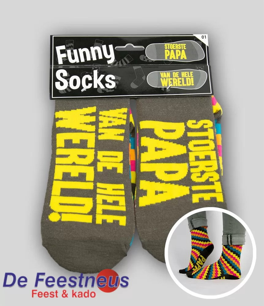 Funny Socks, vrolijke sokken in verschillende kleuren. Op één voet staat ‘Stoerste papa’ en op de andere voet ‘van de hele wereld!!’. De sokken zijn erg leuk om cadeau te geven met vaderdag of met je vaders verjaardag. Ze zijn gemaakt van katoen en de maat is one size.