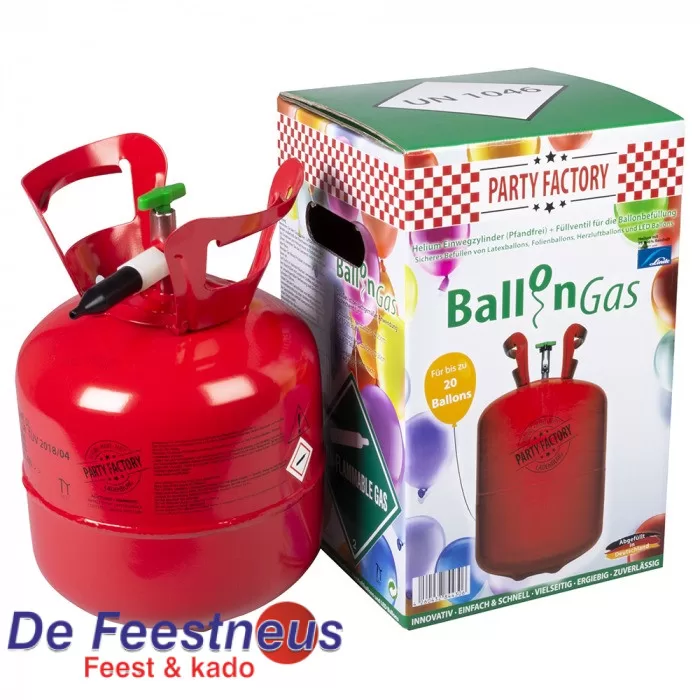 Deze helium wegwerpfles voor maximaal 20 ballonnen is zowel geschikt voor het vullen van latexballonnen als voor het vullen van folieballonnen. De bediening is kinderspel – je vindt gedetailleerde instructies bij de levering. De inhoud van de fles is gecomprimeerd en is voldoende voor maximaal 20 latexballonnen. De gemiddelde vluchttijd van een ballon is ongeveer 6-7 uur bij goed weer. Je kan de fles gemakkelijk in de plastic container gooien. Zorg er wel voor dat de fles helemaal leeg is.