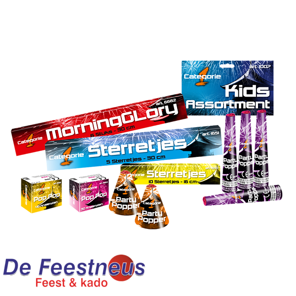 Kids Assortment is een 98-delig pakket met diverse types junior vuurwerk. Bijvoorbeeld Sterretjes met een lengte van 30 centimeter, Sterretjes met een lengte van 16 centimeter, spectaculaire Morning Glory sterren met een lengte van 40 centimeter, Party Poppers, Bottle Poppers, Knalerwten en trektouwtjes.
