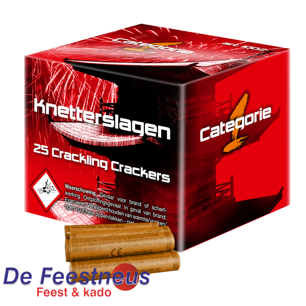 Doosje met 25 stuks Knetterslagen. Deze knetterrotjes hebben het zelfde formaat als de oude bekende kanonslagen. Een oude bekende met een nieuw effect en jasje.