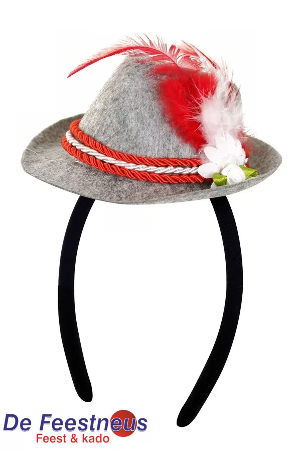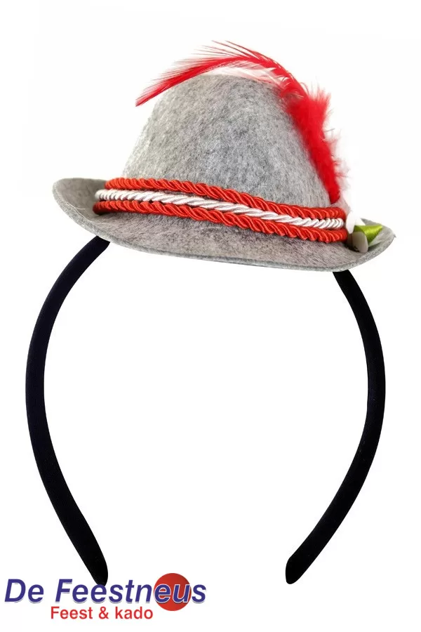 Schattig klein grijs met rood tirolerhoedje op haarband.