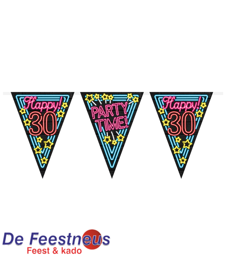 Neon party flag met 30 jaar is uitermate geschikt om een feestje extra feestelijk te maken. Door de gebruikte kleuren met zwarte achtergrond vallen de neon letters extra op. De neon vlaggetjes zijn gemaakt van plastic en de slinger met vlaggetjes is 10 meter lang.