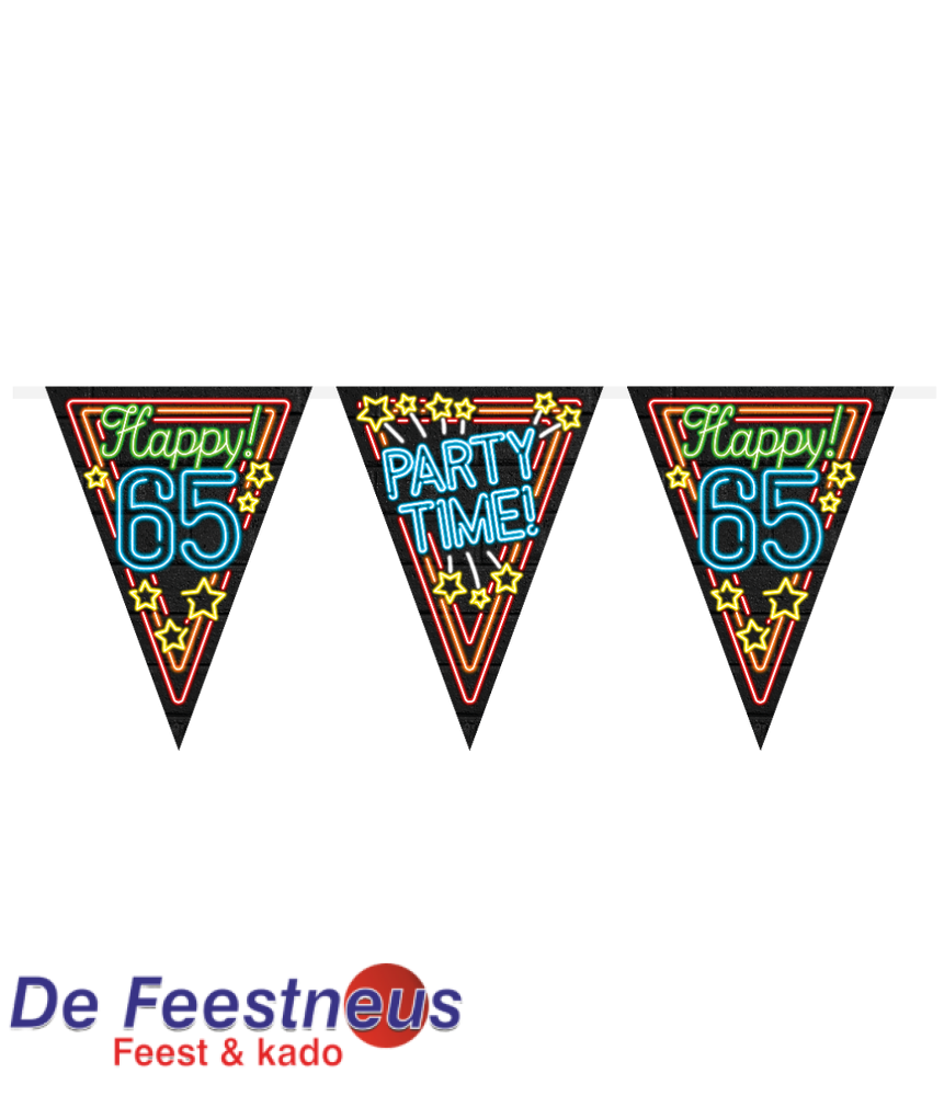 Neon party flag met 65 jaar is uitermate geschikt om een feestje extra feestelijk te maken. Door de gebruikte kleuren met zwarte achtergrond vallen de neon letters extra op. De neon vlaggetjes zijn gemaakt van plastic en de slinger met vlaggetjes is 10 meter lang.