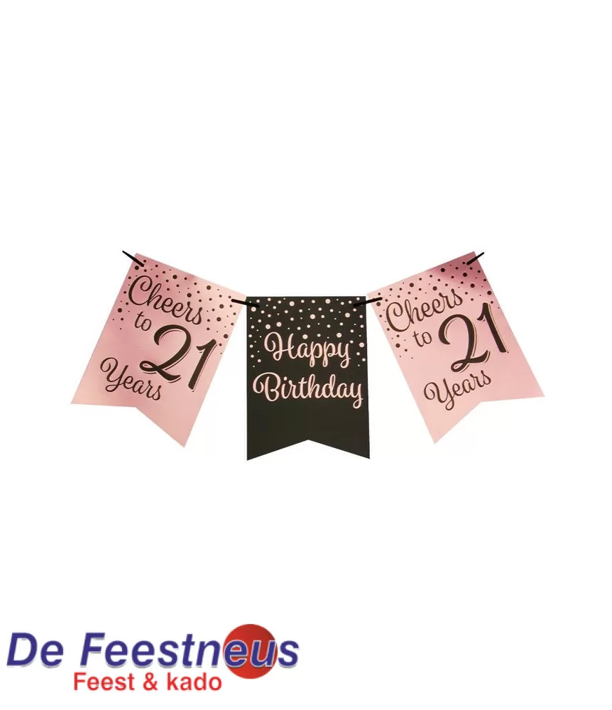 De rose/black party flag banners maken goede sier op een feestje zoals bijvoorbeeld een jubileum, maar ook op een verjaardagsfeest zoals deze rose/black party flag banner met opdruk 21. Door de gebruikte kleuren hebben deze flag banners een luxe maar toch feestelijke uitstraling! De vlaggetjes zijn gemaakt van folie met een bedrukking aan beide kanten.
