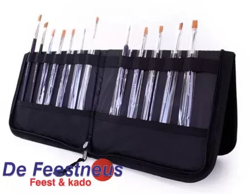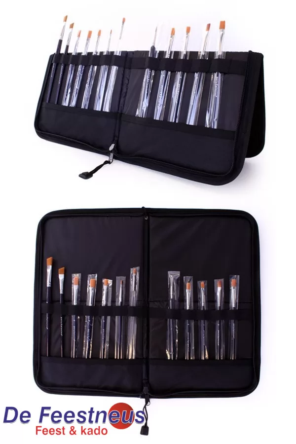 Berg je penselen netjes op met dit professionele penselen etui. Dit etui kan worden opengevouwen en staand worden neergezet voor extra comfort. De houder beschikt over veertien penseel vakjes en heeft een ritssluiting.