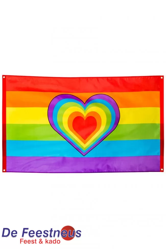 Regenboog vlag met hart – Deze gekleurde vlag is gemaakt van polyester en is ongeveer 90 cm hoog en 150 cm breed. Het toont 6 gekleurde banden in regenboog kleuren met in het midden een hart in dezelfde kleuren. De regenboogkleurige vlag met hart is perfect voor een gay pride parade!