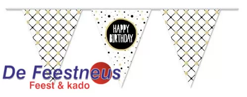elkaar afwisselen. Het Happy Birthday vlaggetje heeft witte letters in een zwarte cirkel, die