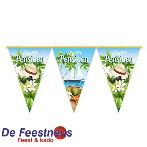 Vlaggenlijn met plastic vlaggetjes, bedrukt met de tekst: ‘Hoera pensioen’. De vlaggenlijn heeft een totale lengte van 10 meter.